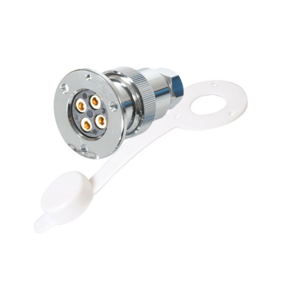 12V däckskontakt i kromad mässing med packning och plastlock monterat på kedjan.