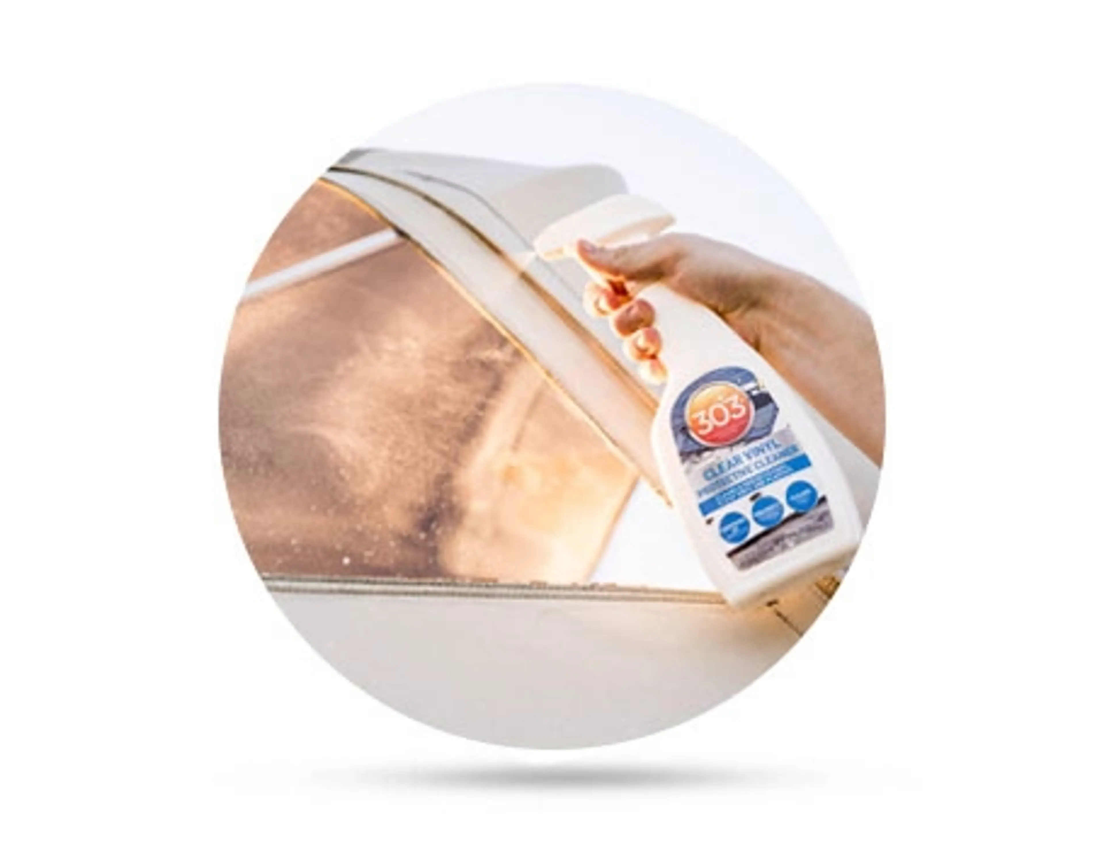 2: Spraya 303 Marine Clear Vinyl Protective Cleaner direkt på ytan eller på en mikrofiberduk/mjuksvamp (Ej i direkt solljus).
