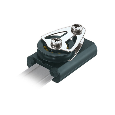 Ett Ronstan ändstopp med block – Series 19 används tillsammans med Series 19 Battencar-systemet på masten. Det är alltså inte ett vanligt ändstopp, utan en ändpunkt med integrerat block som är en aktiv del av lattsystemets trim.