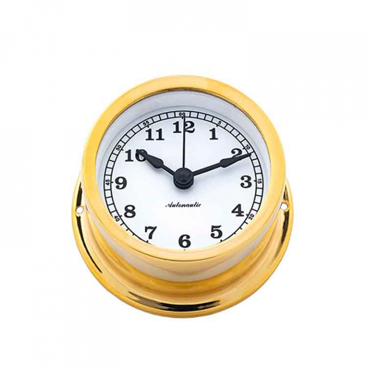 Autonautic Skeppsur Minor 72 är det minsta uret i serien med en bas på endast 72 mm. Tillverkat i förgylld mässing och skyddat med mineralglas. Uret drivs av exakt Quartz-teknologi med en frekvens på 32,786 KHz och uppfyller DIN 8325-standard för tidtagning. Perfekt för mindre båtar, husvagnar eller autocampers där utrymmet är begränsat men funktionalitet och stil är avgörande. ISO 9001-certifierad kvalitet garanterar lång livslängd och precision.