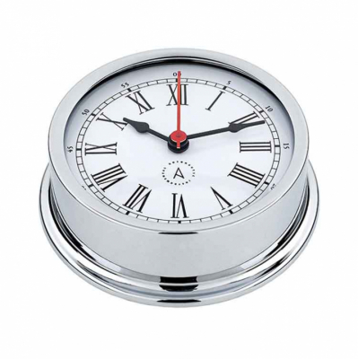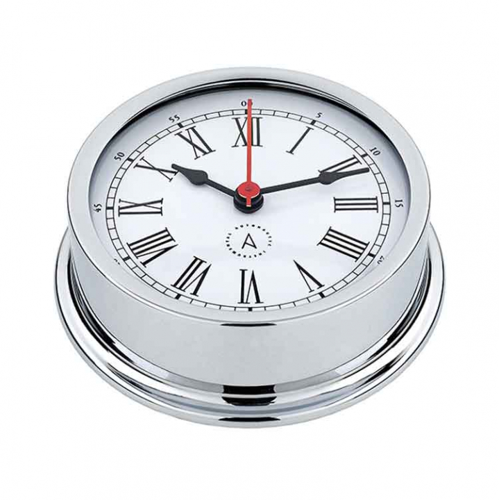 Autonautic Skeppsur R120C-R ingår i Pacific 120-serien, designad för fritidsbåtar och mindre kommersiella fartyg. Med en bas på 120 mm och en vit urtavla med romerska siffror kombinerar uret klassisk maritim stil med modern precision. Tillverkat i förkromad mässing och utrustat med quartzverk för exakt tidhållning. Easy Fix System ger enkel åtkomst för batteribyte och justering utan demontering. ISO 9001-certifierad kvalitet – handgjort i Barcelona.