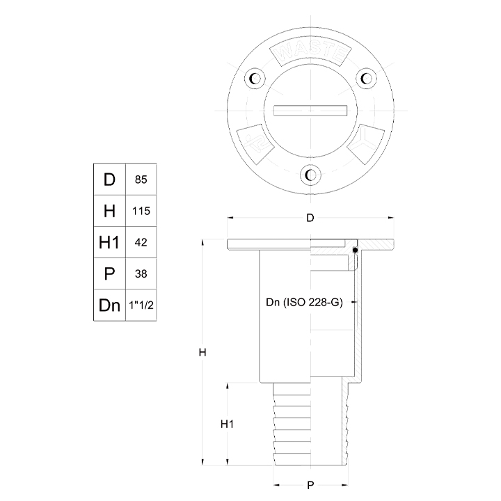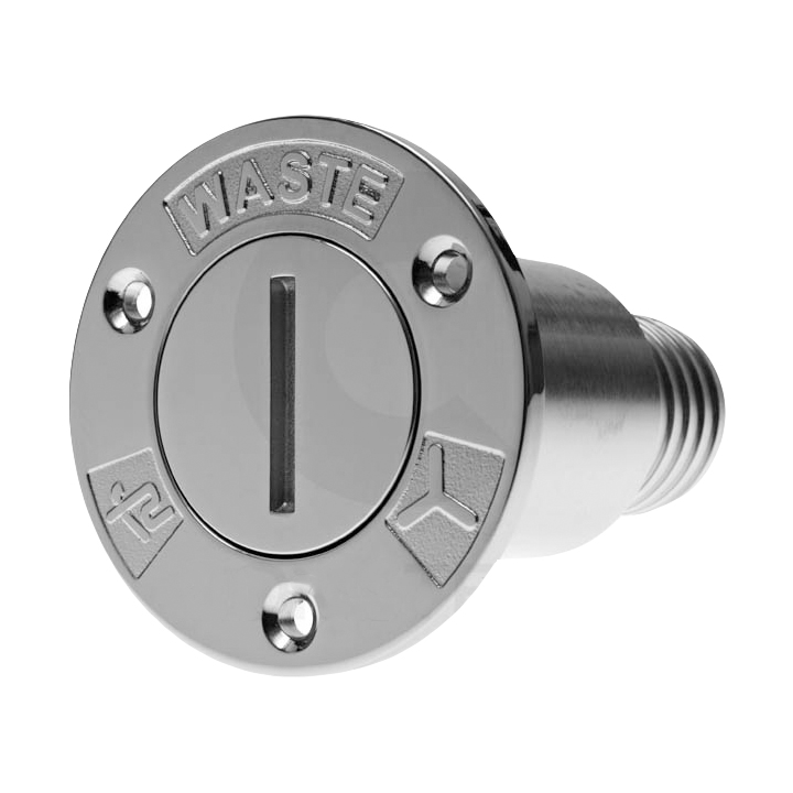 Däcksförskruvning ”WASTE” för tömning av septiktanken. Däcksanslutningen följer ISO 8099:2000 standarden.