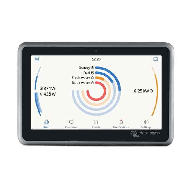 Gå enkelt in i ditt system genom Victron Remote Management(VRM) portalen, eller få direktåtkomst genom att använda den inbyggda pekskärmen, en multifunktionell skärm (MFD) eller med VictronConnect appen tack vare dess inyggda WiFI-åtkomstpunkt.
