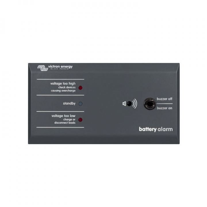 Battery Alarm GX är en liten lågkostnadslarmpanel som övervakar din batteribank. Det har både ljudlarm och visuellt larm samt en potentiellt ledig kontakt med normalt öppen och normalt stängda kontakter. Larmtröskel och hysteres kan programmeras med DIP-switchar.