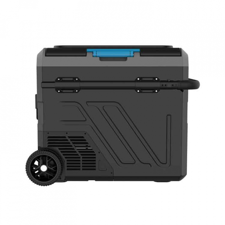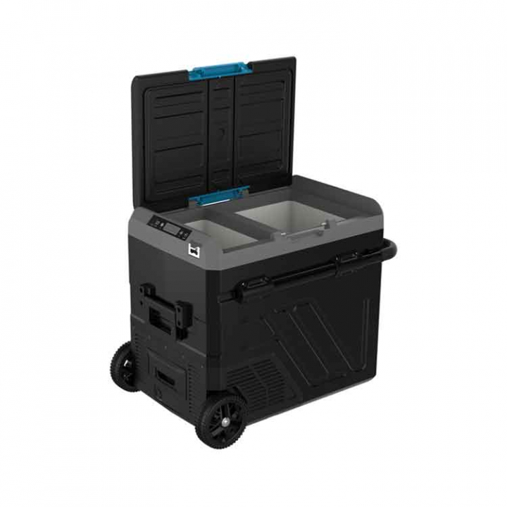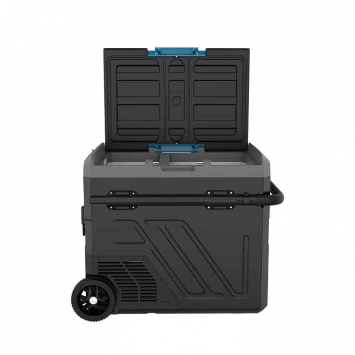 Robust kylbox med hjul och handtag. Boxen har två temperaturzoner och klarar frysgrader ner till minus 20 grader! Locket kan öppnas från båda sidor.