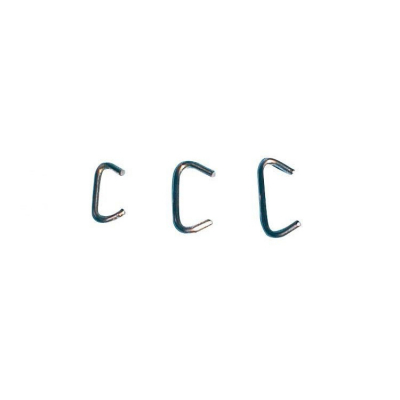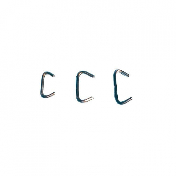 Klammor i rostfritt stål till gummicord, kommer i 100-pack i tre olika storlekar. - Egenskaper