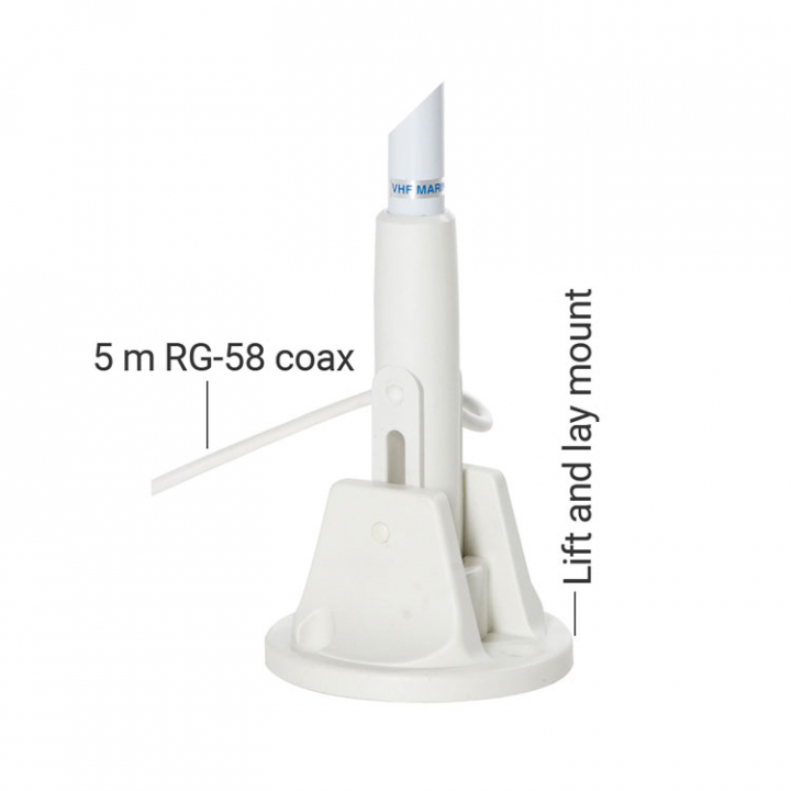 Kompakt 1,5 m VHF-antenn för motorbåtar med fällbart fäste, 5 m RG-58 koaxialkabel och PL-259-kontakt.