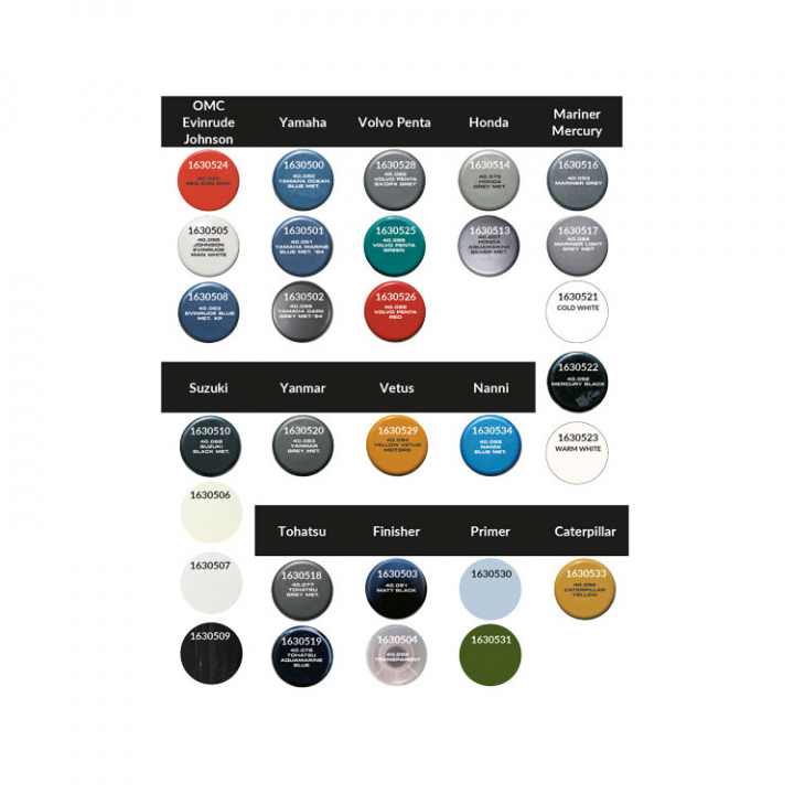 TK Line colorspray/motorfärg i många olika färger. Snabb torkning och väderbeständig. Ta bort rost eller repor med vått slippapper, rengör och applicera TK Line Primer (Antirust). Därefter sprutas Colorspray på med ett avstånd av 30 cm.