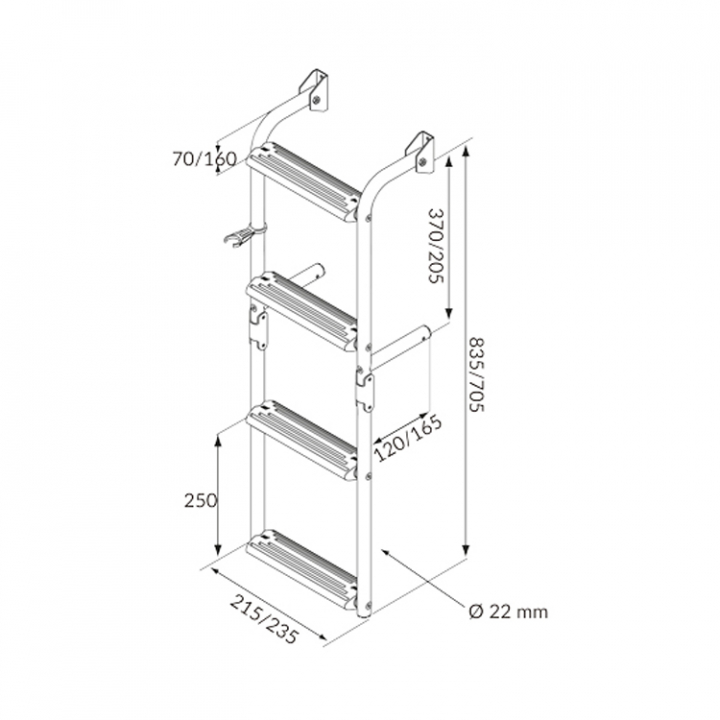 De övre fästena kan bytas ut mot ett hängfäste så att stegen enkelt kan bort. Stegen kan justeras så att fötterna alltid kliver på en horisontell yta – en bra säkerhetsfaktor.