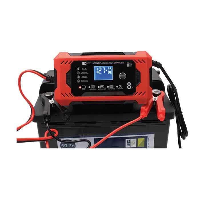 1852 Smart Charger 8A 12V är en användarvänlig och effektiv batteriladdare med en LCD-display som visar spänning, ström och laddningsinformation under användning. Den levereras med flera laddningsprogram anpassade till olika batterityper som STD, AGM/GEL, MC och LiFePO4/Litium, och har även ett dedikerat reparationsläge för att förlänga batteriets livslängd.