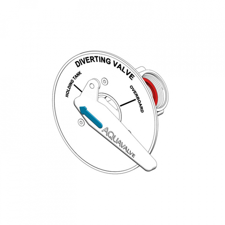 Kompletteras med Aquavalve slangsockel. Handtaget gör det möjligt att skifta mellan septiktank eller tömning överbord.