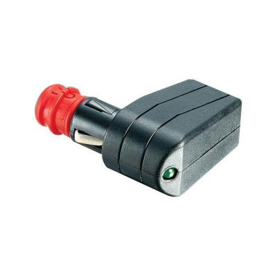 Vinkelkontakt med funktionsdiod för 12/24 volt som passar både cigarettuttag och standarduttag. Kontakt med godkännande DIN EN ISO 4165. 2,5 mm² kabel måste användas.