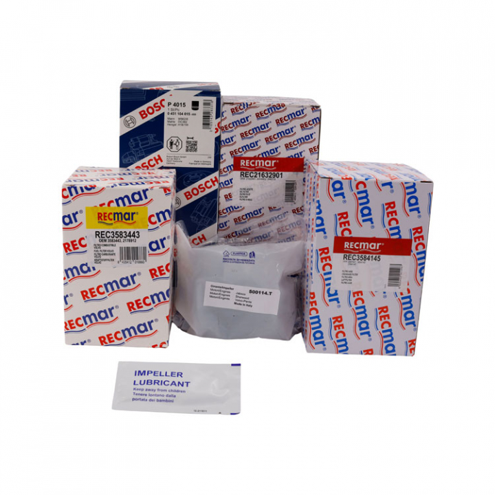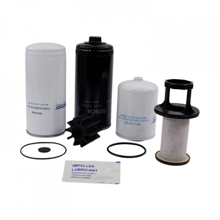 Volvo Penta servicesats för serierna D4, OEM nr. 21704968, 21198342 Innehåller oljefilter, förfilter (vattenavskiljare/CAV 296), bränslefilter och impeller.