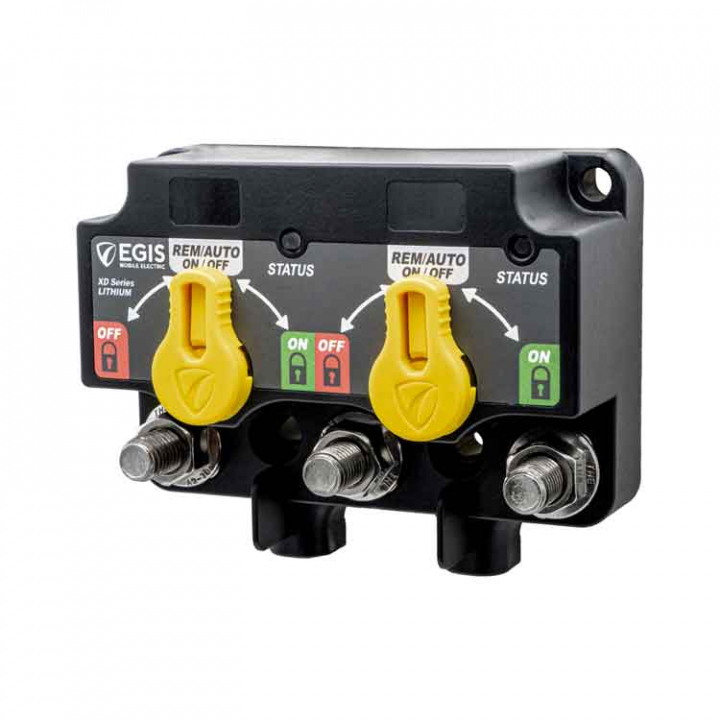 Egis XD DUAL 500A Litium fjärrstyrd huvudströmbrytare designad för Litium batterier. Enheten kan hantera högre spänningsnivåer vid laddning och urladdning.