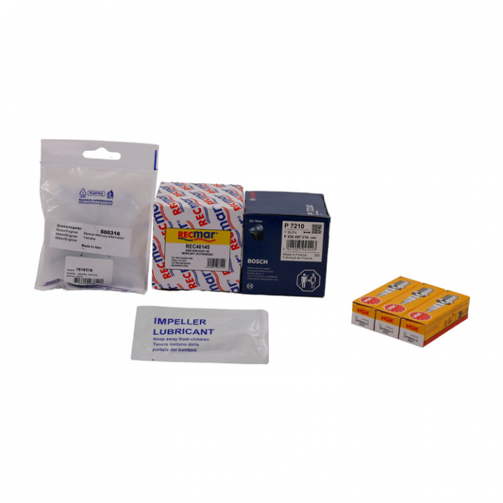 Yamaha servicesats till F40B (2000-09) Innehåller oljefilter, bränslefilter, tändstift och impeller.